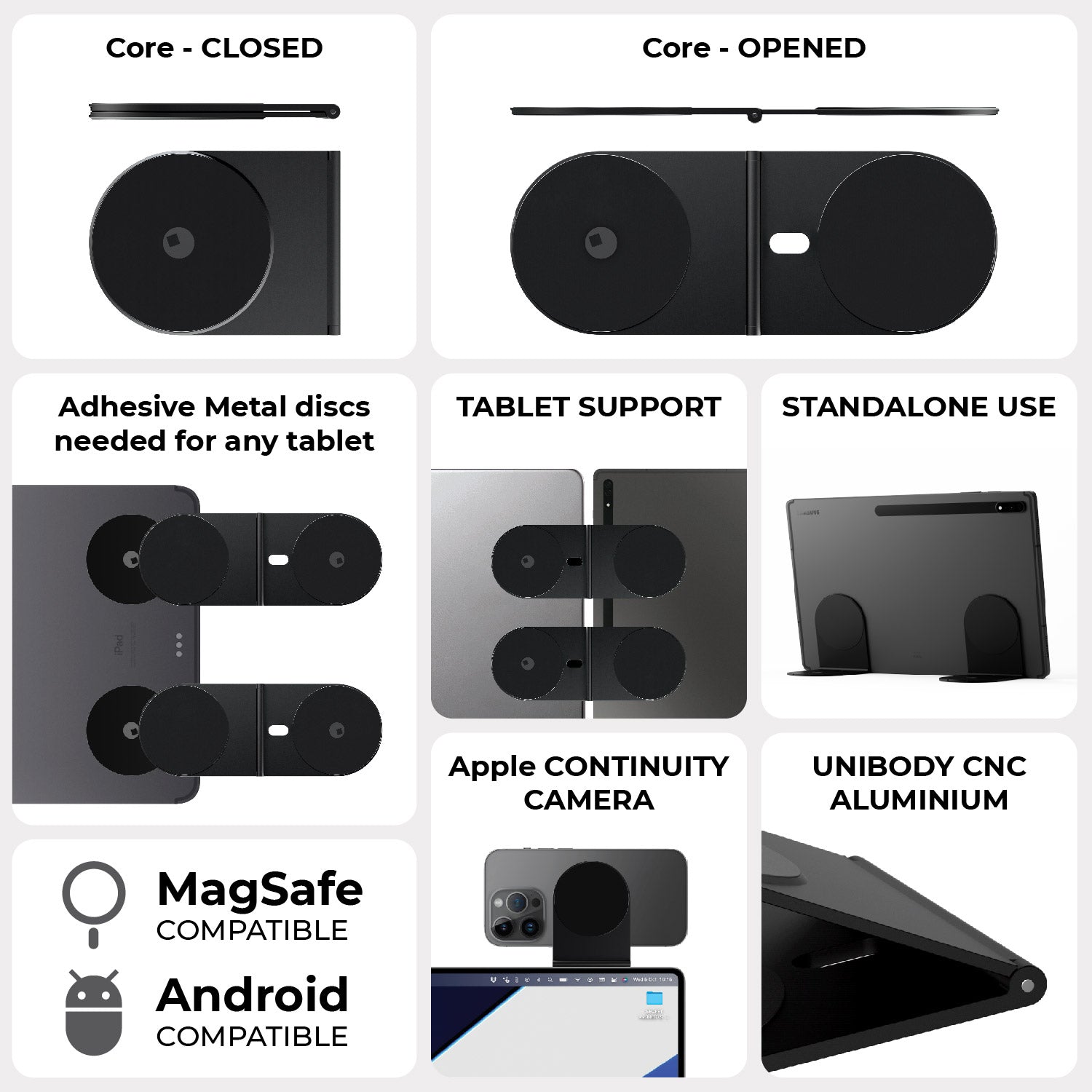 EDGE® Pro Tablet Kit comes as a set of two EDGE Pro Cores, which can magnetically hold your tablet attached to your laptop. The Core is not just a mount but it is the basic component of the ecosystem, you can now easily detach it from your laptop and keep using it in standalone mode, magnetically holding your iPhone, Android phone or tablet!