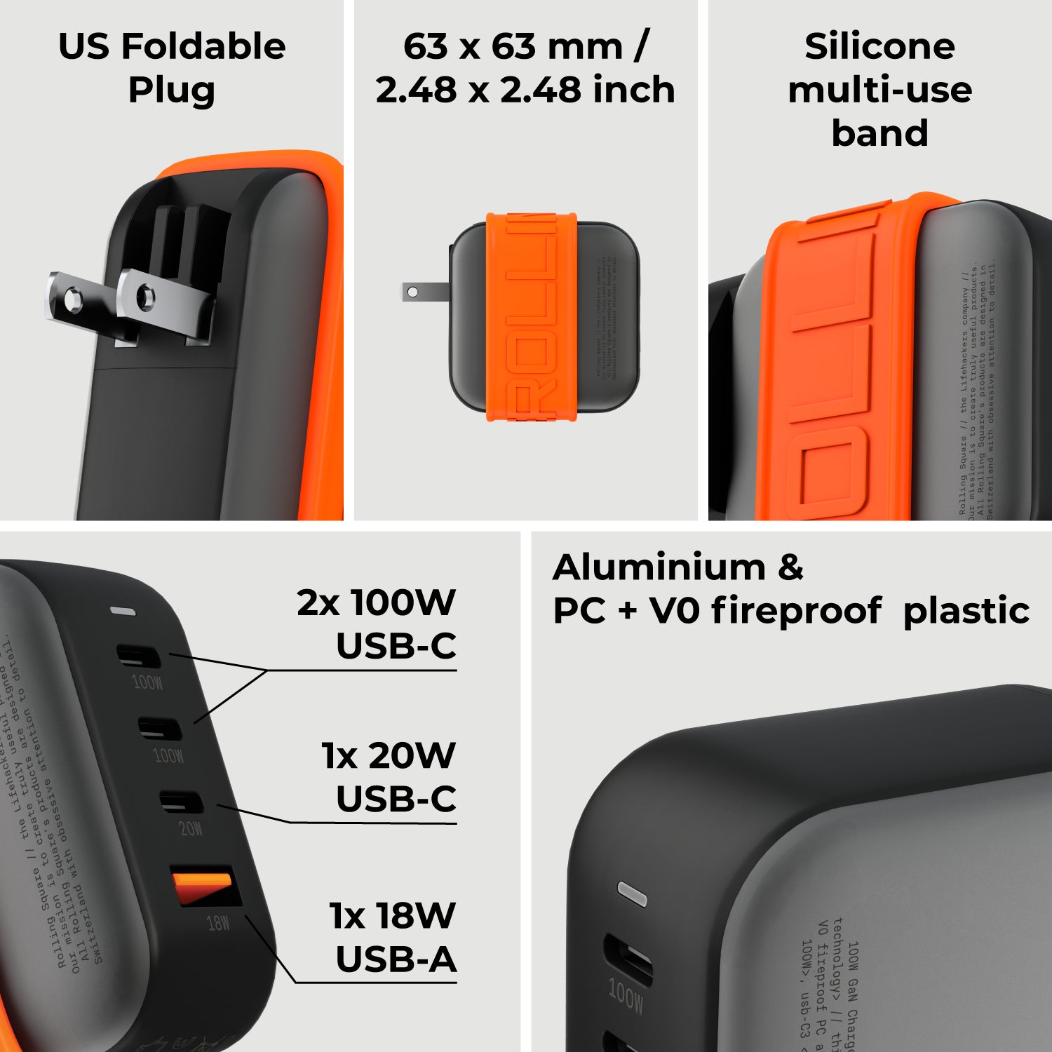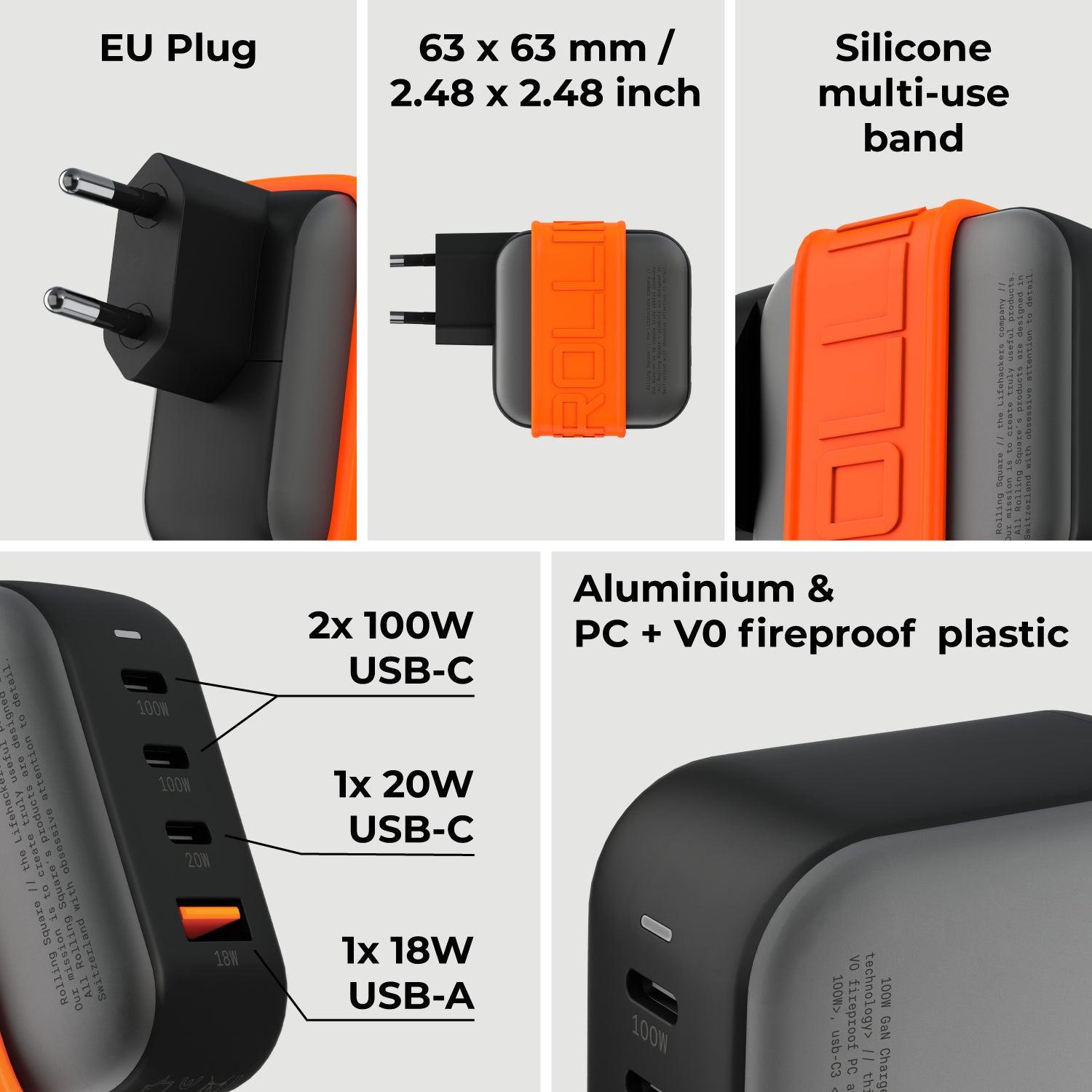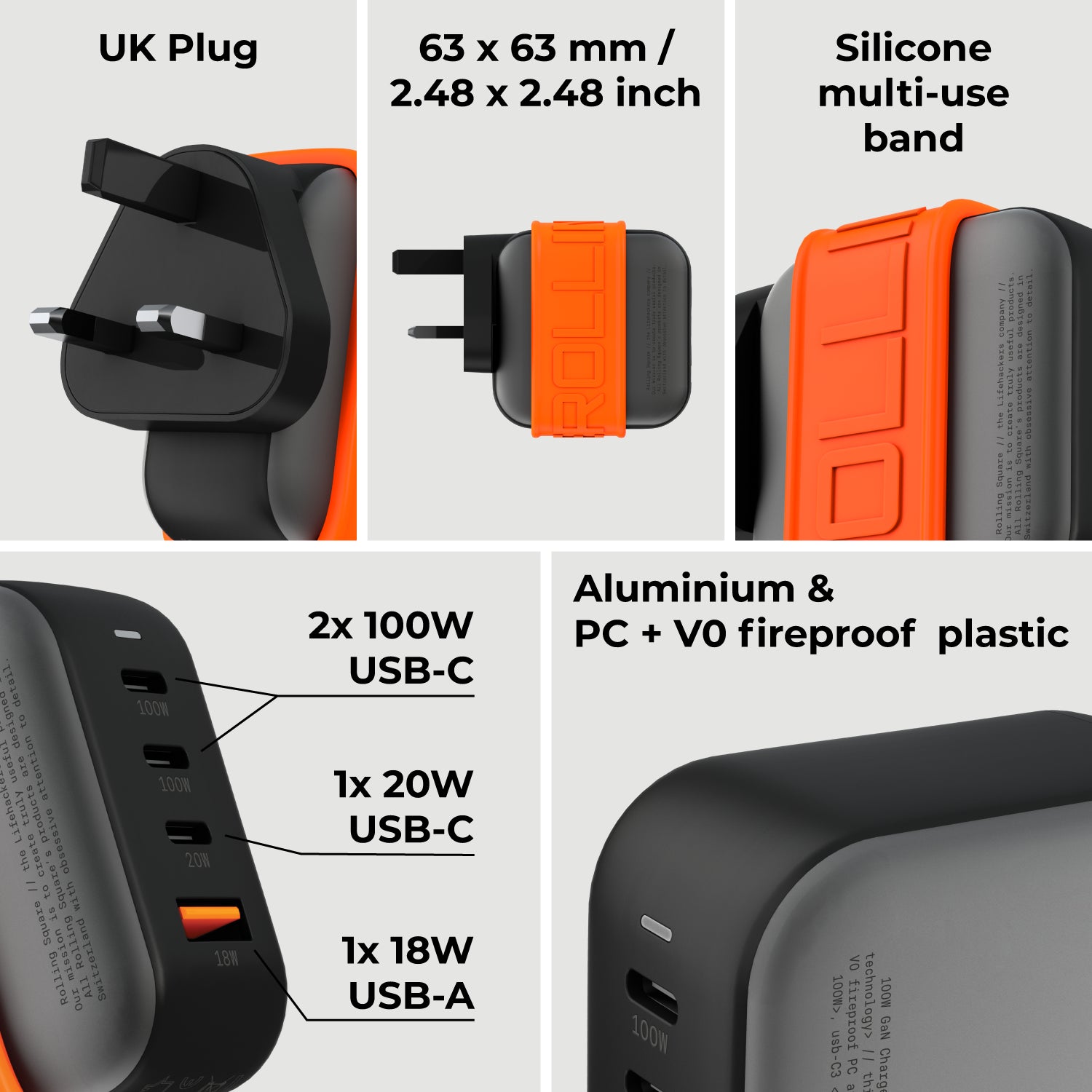 45% smaller than traditional chargers, our 100W GaN charger blends a compact, travel-friendly form with high-performance charging. Its dual USB-C PD 3.0 (100W) ports, an additional USB-C (20W), and USB-A QC 3.0 (18W) port make it the ultimate all-in-one solution. The heat-dissipating aluminium design paired with a stylish, multifunctional silicone band guarantees efficiency and tidiness on the go, allowing you to secure and carry any additional cable with your charger.